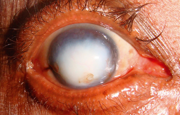 Слепой глаз из-за тяжелого гнойного кератита, возникшего после незначительной ссадины роговицы кукурузным листом, которая привела к образованию плотных рубцов на роговице.